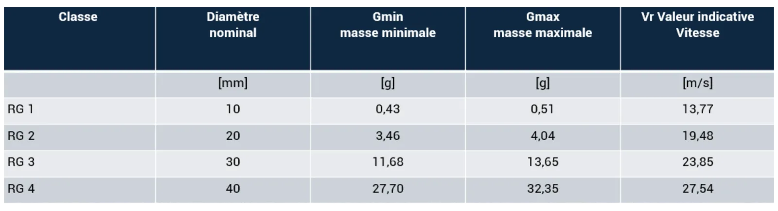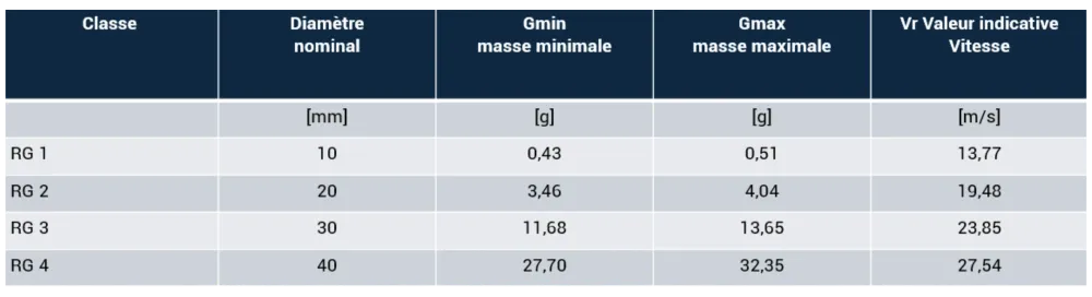 Voici un tableau récapitulatif des caractéristiques des grêlons utilisées selon cette norme :