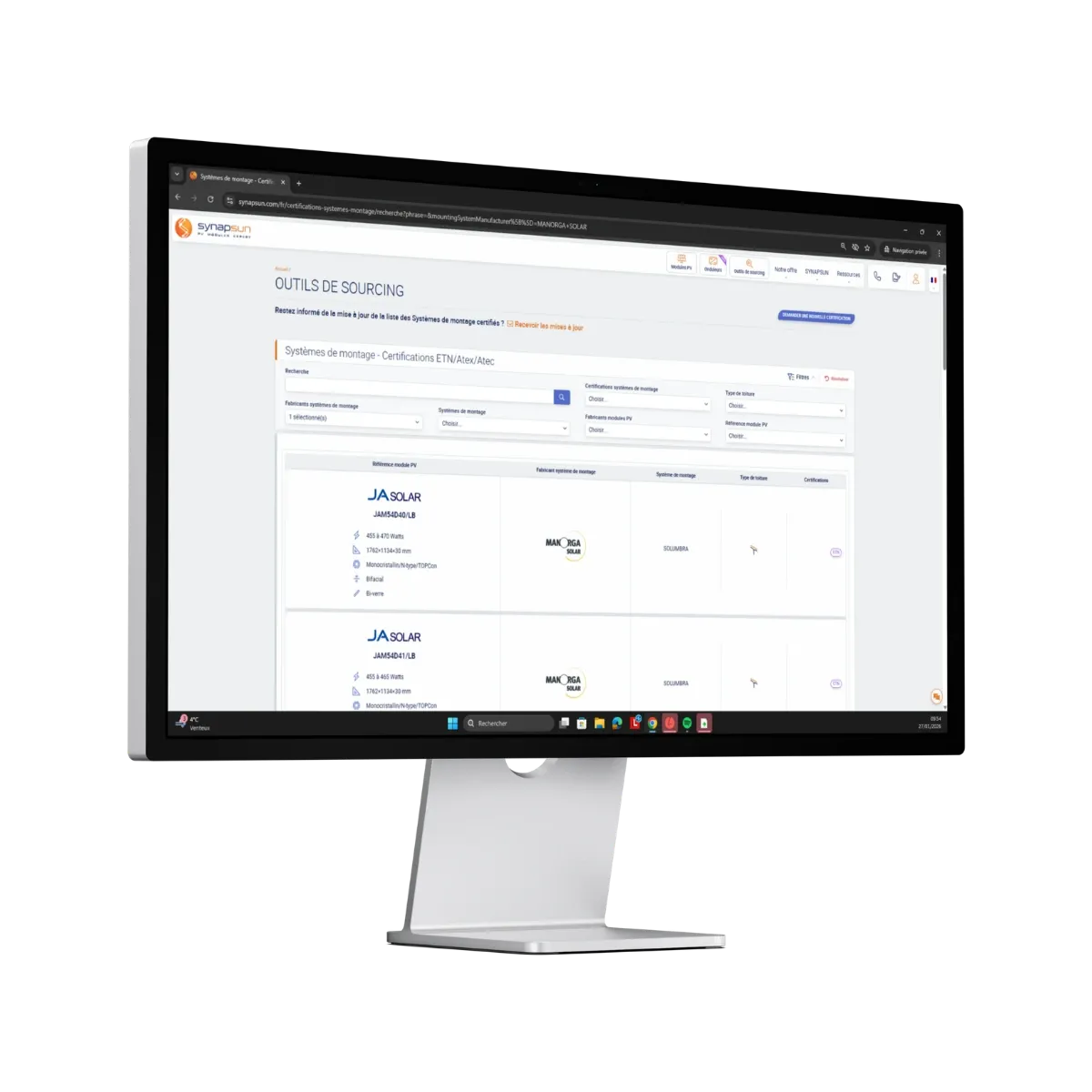 Grâce à l’intégration de ce moteur de recherche dédié aux certifications ETN, ATec, ATEx et Broof T3, vous pouvez identifier rapidement les modules photovoltaïques avec les systèmes de montage ManOrga Solar.