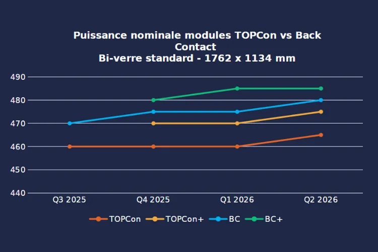 Avec l’ensemble de ces évolutions, la roadmap de puissance des modules TOPCon tend à rejoindre celle des modules Back-Contact à dimensions équivalentes… pour un temps.